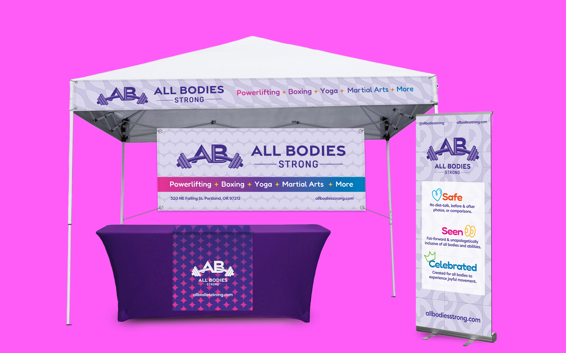 When Portland's third annual Body Positive Block Party presented the perfect opportunity to connect with their core audience, I designed a complete event presence. Eye-catching banners and signage, interactive display concepts, branded giveaways and swag, plus stickers and shirts for purchase turned their booth into a hub of activity. Between deadlifting demos, trial week sign-ups, donations for their Access Granted program, and merch sales, the booth didn't just attract attention, they embodied the ABS experience in real time.