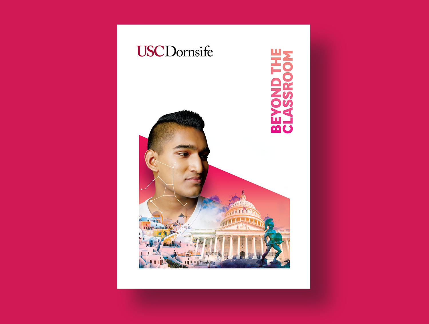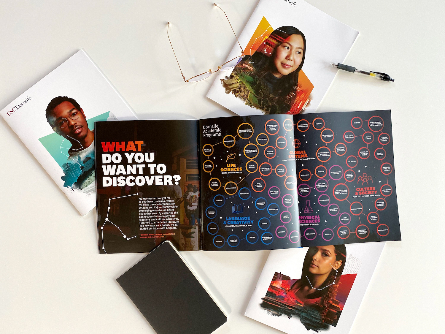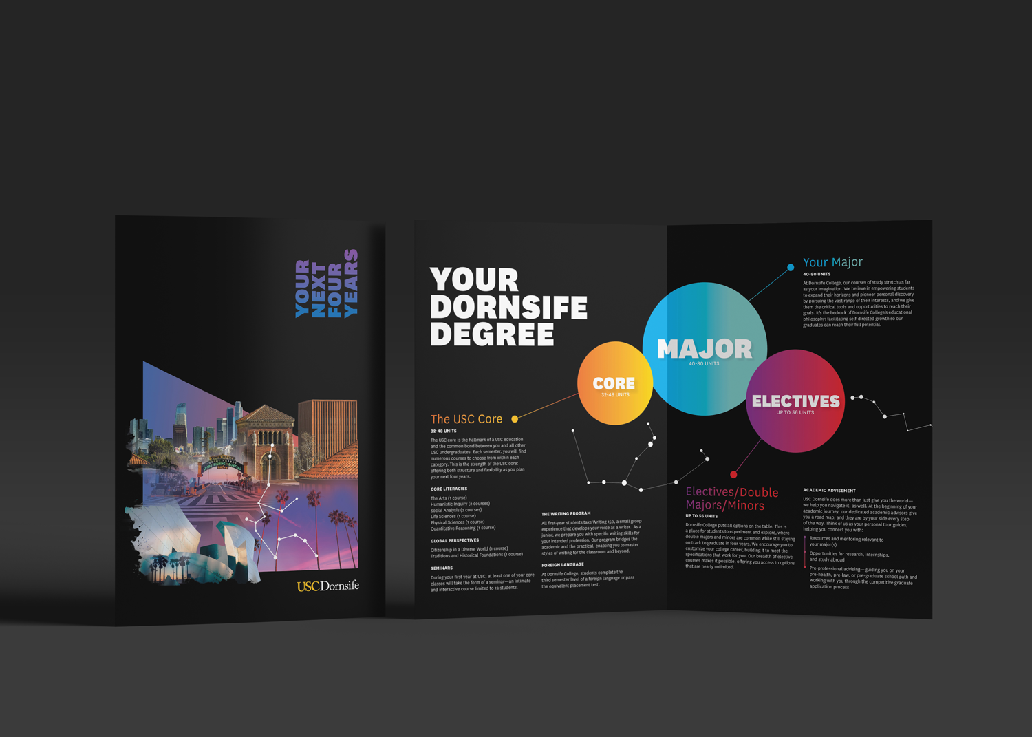 Dornsife College is the largest school at USC, responsible for 1,300 new students each year navigating 80+ possible majors. They were getting lost in the noise of all the other schools at USC and seen as the 'default', which didn't capture what made Dornsife special: the ability to double major, travel, intern, and craft a truly personalized education. They needed a creative partner to push beyond convention and let design tell the story their words couldn't.