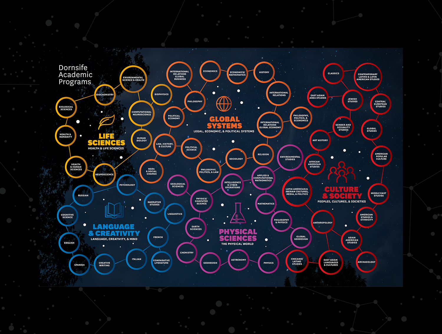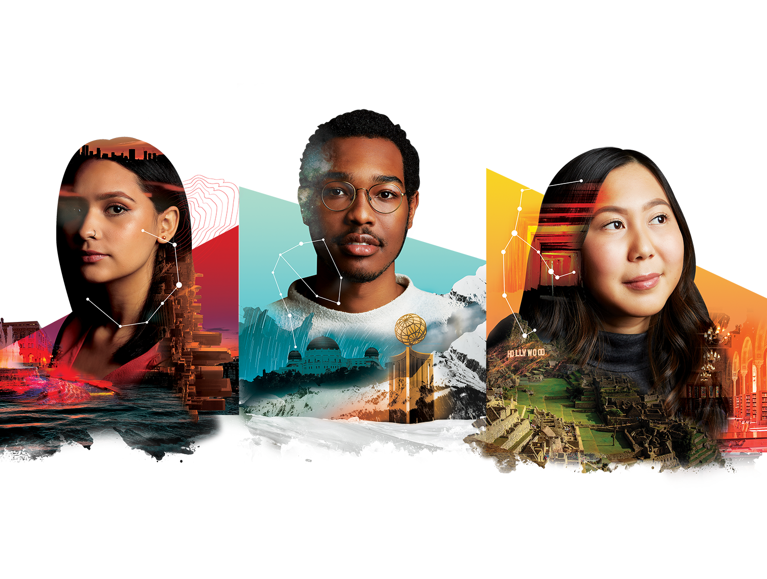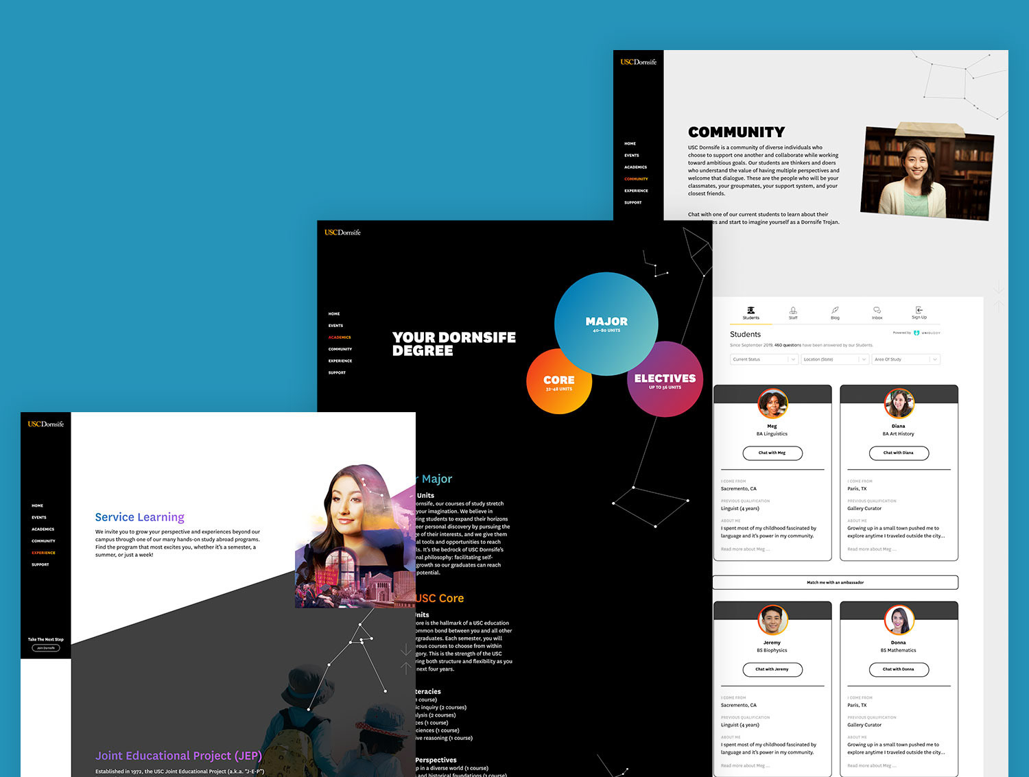 The visual identity was a complex one involving composites showcasing real USC Dornsife students living multifaceted academic lives and constellations pulled from the night sky on the day Dornsife first opened. Photography from LA and study abroad destinations highlighted in student opportunities while the constellation evoked a navigational tool for students charting their own four-year journey.