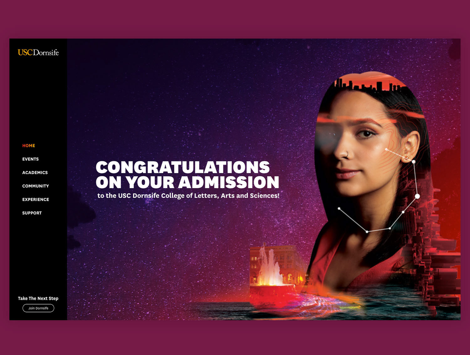 After the campaign's success, Dornsife wanted to extend the identity online. I directed strategy and oversaw the design and development of an admitted student microsite aimed at reducing melt by re-emphasizing Dornsife's unique benefits through the new visual language we'd created.